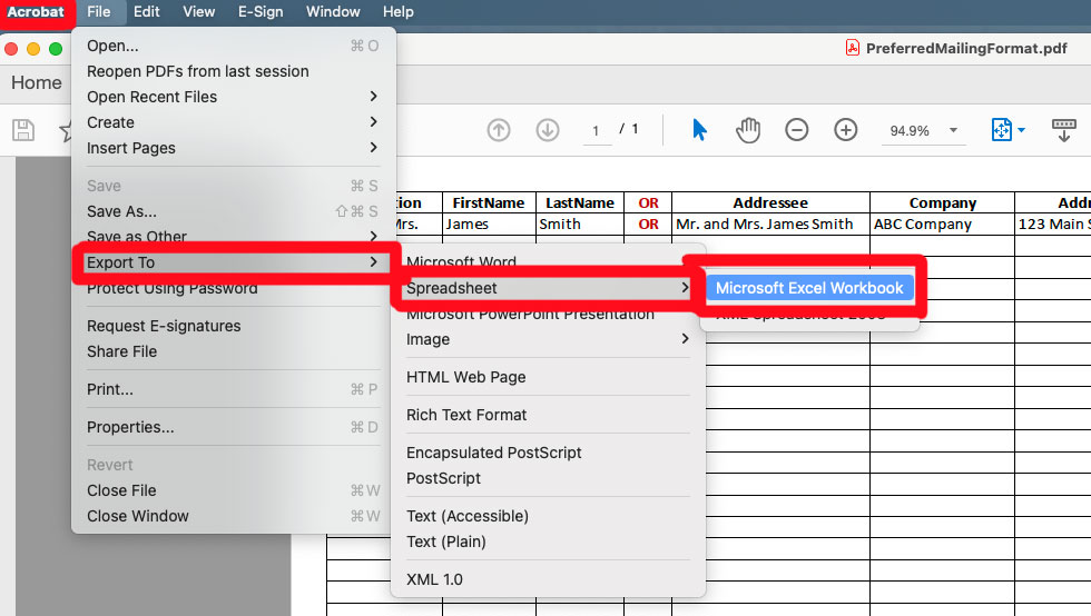- Addressing available. Click here for example mailing list template. This is a .pdf, but can easily be exported to excel by doing the following: